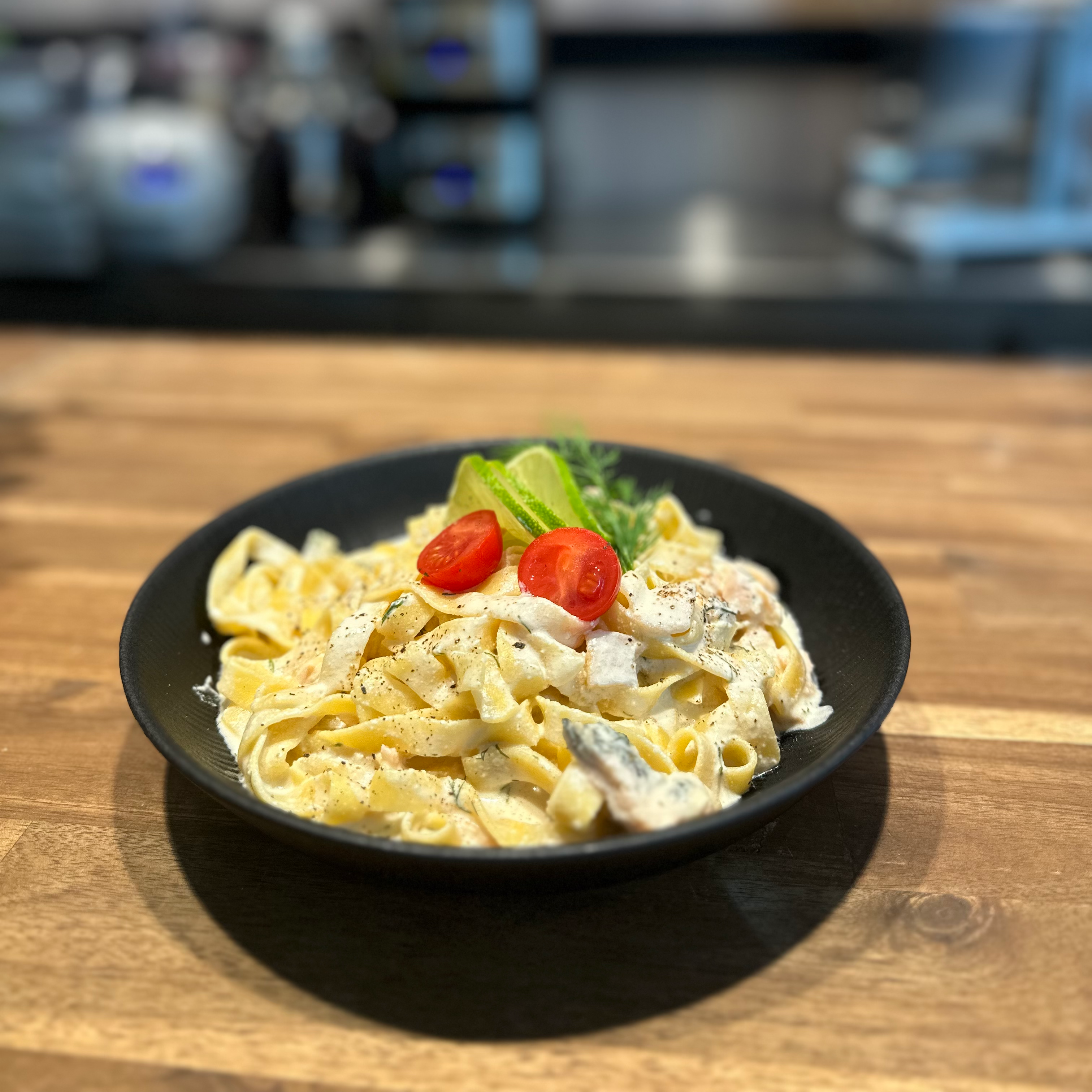 Mit Reis, Alb-Quinoa oder frischer Pasta, Salat der Saison, Kidneybohnen, gedünsteter Brokkoli, Karotten und Hüttenkäse. Dazu ein Dressing deiner Wahl (Sweet Chili, Joghurt, Sriracha-Mayo oder Erdnuss)