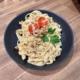 Handgemachte Fusilli (aus Hartweizengrieß und Eiern aus Freilandhaltung), Pesto aus frischem Basilikum, gerösteten Pinienkernen, Olivenöl und frisch geriebenem Parmesan und Sahne.