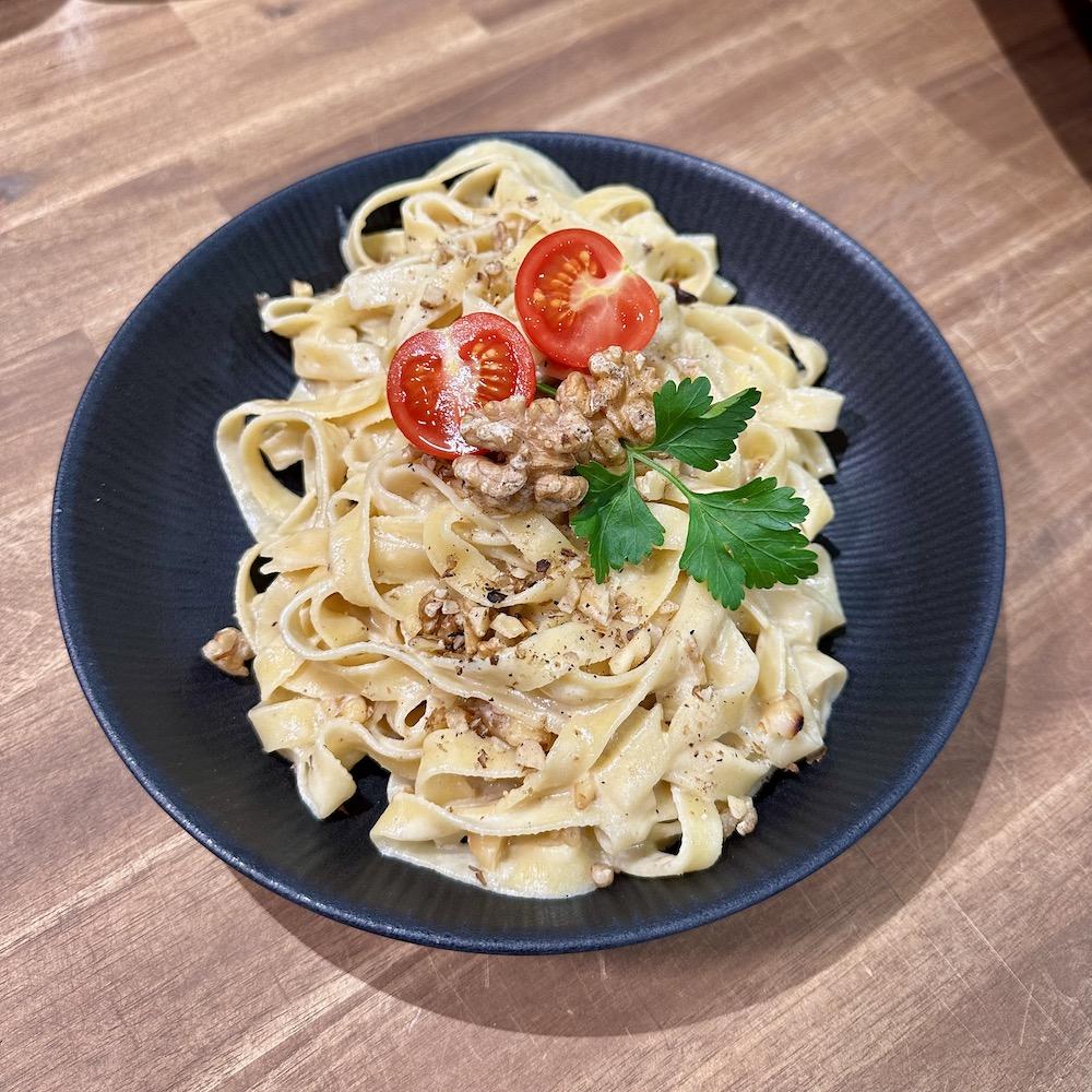 Fein gebräunte Nussbutter trifft auf geröstete Walnüsseund eine cremige Béchamelsoße – nussig, mild und wohlig warm.