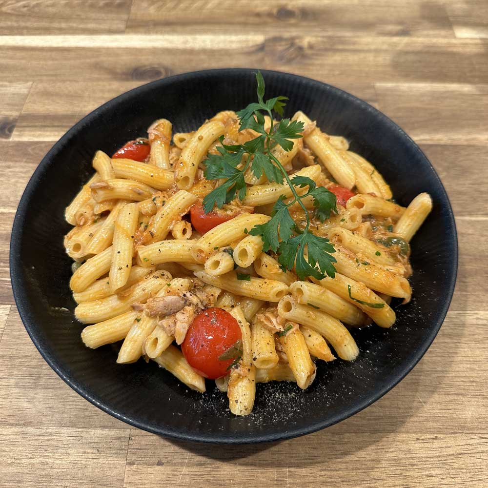 Hausgemachte Penne in fruchtigem Tomatensugo, verfeinert mit Thunfisch, Kapern und Kräutern. Mediterran, leicht & aromatisch.