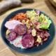 Mit Reis, Alb-Quinoa oder frischer Pasta, Salat der Saison, Linsenpüree, Kohlrabi, gedünsteter Brokkoli, eingelegte Radieschen, Sprossen, Sonnenblumen- und Kürbiskernei Dazu ein Dressing deiner Wahl (Sweet Chili, Joghurt, Sriracha-Mayo oder Erdnuss)