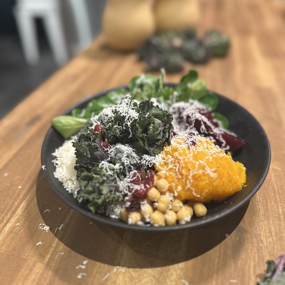 Wärmender Reis, knackiger Grünkohl-Salat, gegrillte lila Süßkartoffeln, Urkarottensalat, Kidneybohnen, cremige Frischkäse-Creme, Granatapfeldressing, geröstete Walnüsse & fruchtige Granatapfelkerne – bunt, nussig & winterlich frisch.