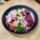 Reis, gedünsteter Brokkoli, Babyspinat, Kidneybohnen, geraspelte Urkarotten, gegrillte lila Süßkartoffeln, roter Rettich, Hirtenkäse, gehackte Cashews mit Rote-Bete-Joghurt-Dressing.